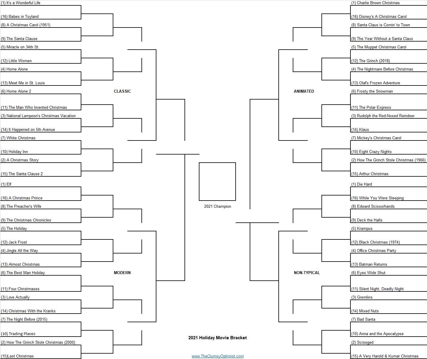 We are all cooped up thanks to the Coronavirus and going a little stir-crazy. I don’t know about y’all but personally movies have been the best mental escape out there. Specifically, this holiday season we watched just so many Christmas movies. It was a great respite from all the suckiness of not being able to get together with my absurdly large family. This bracket topic was suggested by a friend on Facebook (Thanks, Arain!) Like previous years, “scores” will be posted as the percentages from the polls.