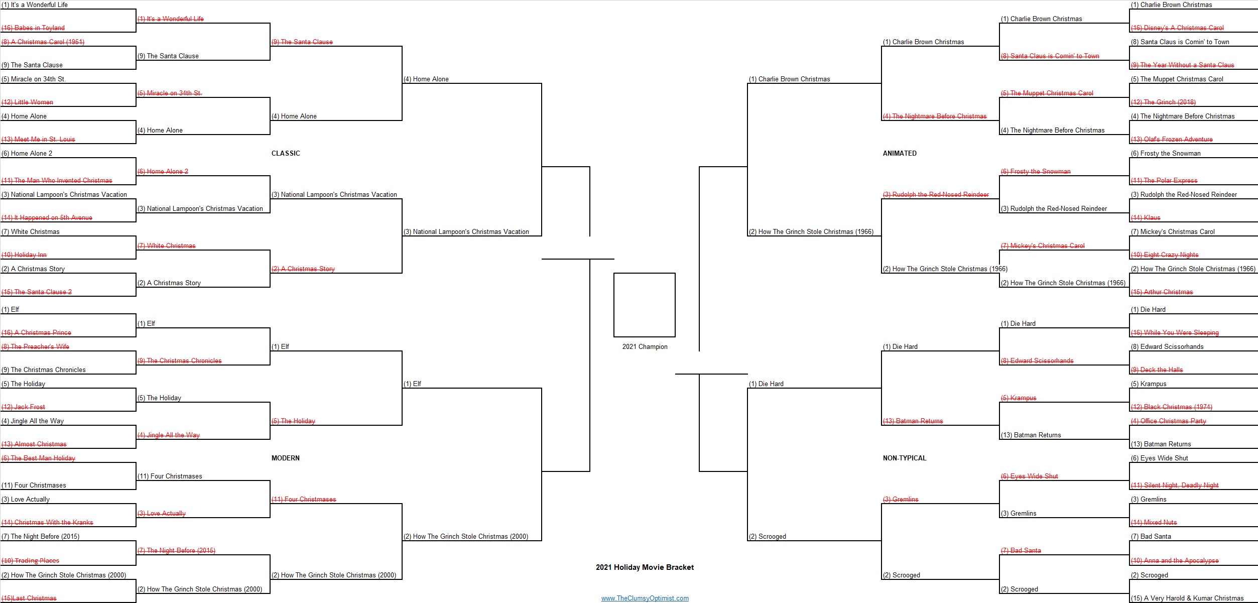 So after two weeks of games and some legit shocking upsets and Cinderella runs, we end up with a Regional Finals that consists of three 1/2 and a 3/4 match-ups. And honestly the 3 and 4 seeds in the Classic Region in Christmas Vacation and Home Alone very well could have been a 1 or 2 seed. Also two of the final 8 teams left, a full 25% of the remaining field, is versions of The Grinch.