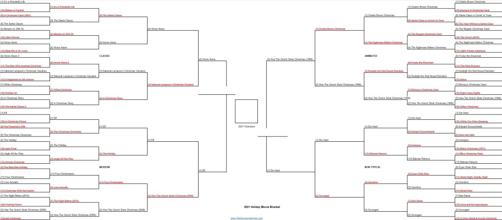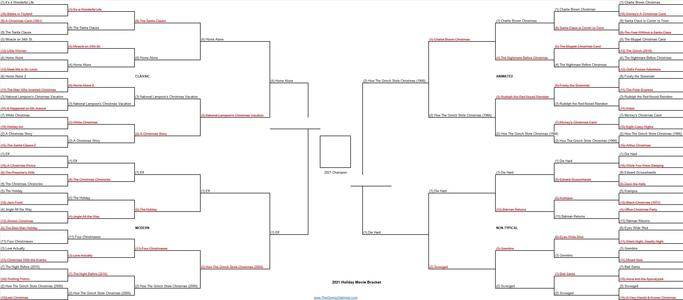 The Modern Region saw our only tie of the tournament so far and had an 11 seed Cinderella get to the Elite 8 but it all came down to the top two seeds as 1 seed Elf just continued rolling, knocking off 2 seed, 2000’s How The Grinch Stole Christmas by a final of 77-23. That makes back to back 77-23 victories by Elf to get into the Semi-Finals. These trouncings were the closest games they have had so far.