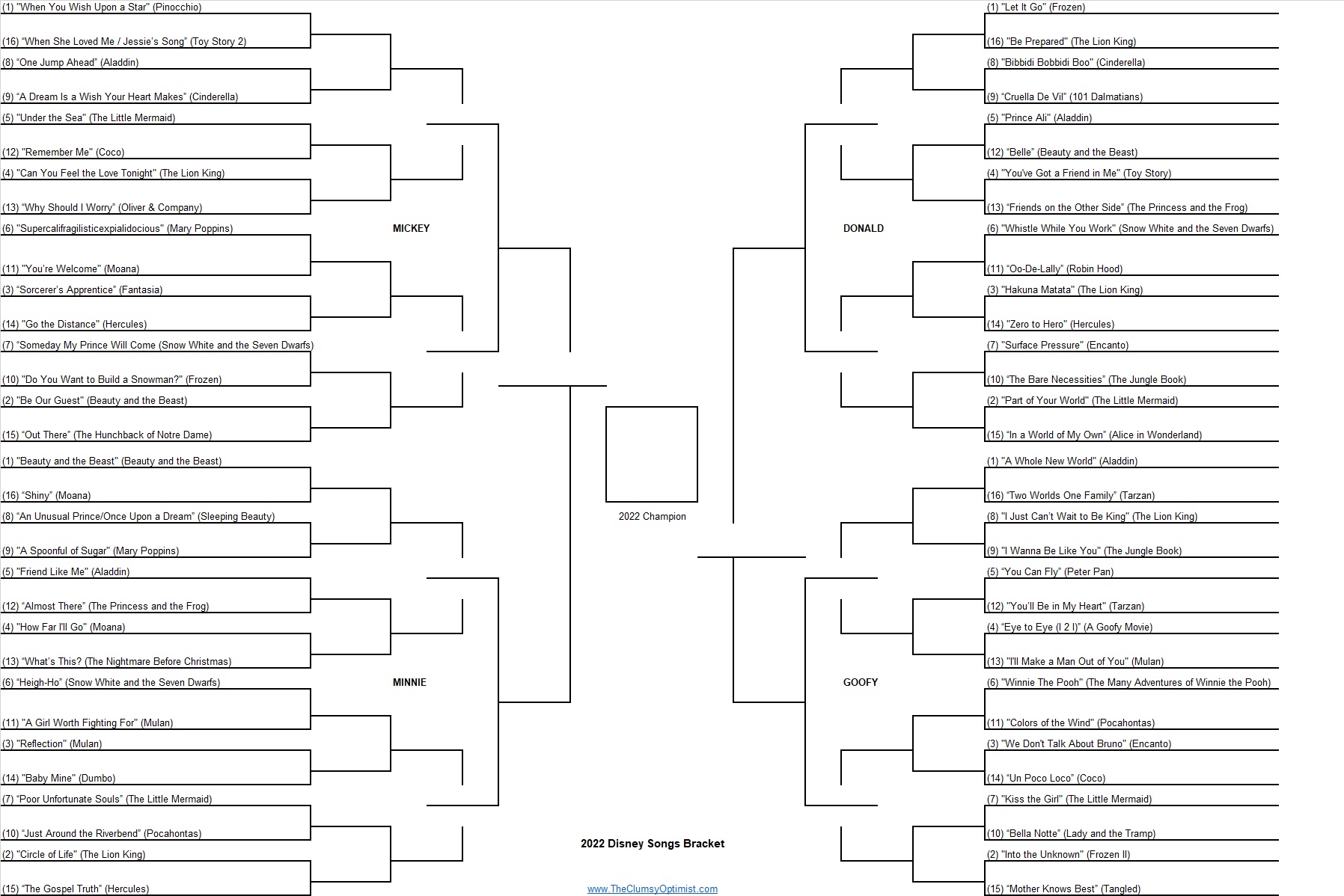 I’m going to be honest with y’all, this year’s bracket was maybe the most difficult one I have had to put together. This bracket lead to a few debates between Mrs. Optimist and I. Folks are serious about their Disney music opinions! I’m sure there are to be quite a few issues taken with how I ended up seeding some of these songs, but I think it’s as good as it was going to get.