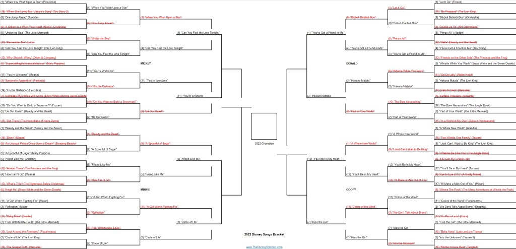 Our other Cinderella seed in the Goofy region just ran out of steam. 11 seed “Colors of the Wind” fell to 7 seed “Kiss the Girl” by a final of 79-21.