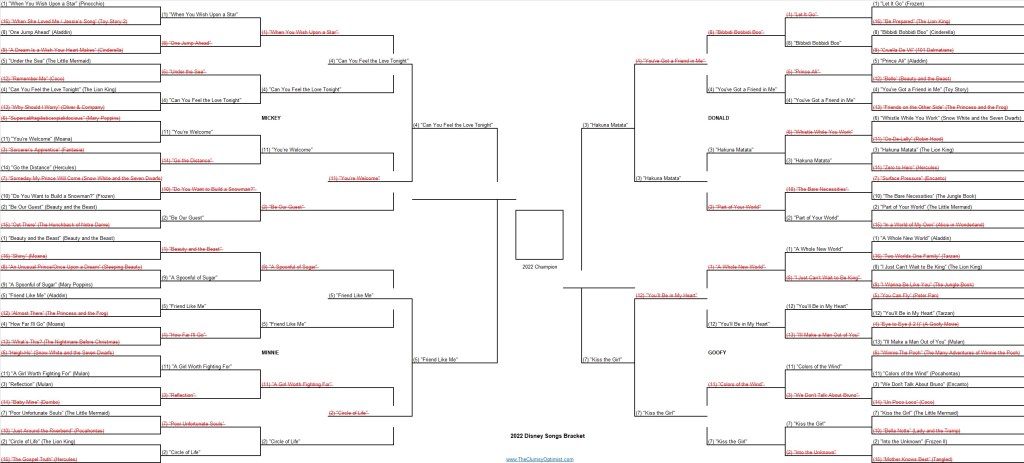 Our Donald Region on the other hand was never in question. The ever beautiful 4 seed, Toy Story‘s “You’ve Got a Friend in Me” tried as hard as they could but ultimately fell hard against the 3 seed “Hakuna Matata” by a final of 76-26. This one was never really close from the opening bell. That gives us 2 of our final four from The Lion King.