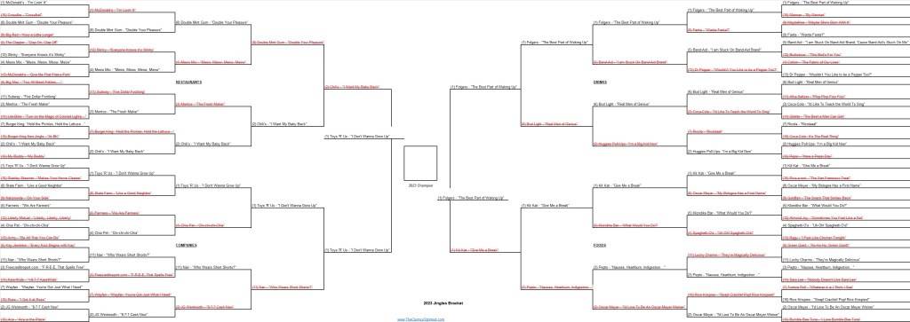 Our Restaurants Region was the only one of the four that ended without the 1 seed making the Semi-Finals. The 2 seed Chili’s earworm “I Want My Baby Back” had a fairly easy run of things as they ran through 15 seed My Buddy 77-23 They came up just short of a full blown 100-0 victory in the Round of 32 winning 96-4 against the OG Burger King jingle. They flew through the Sweet 16 against the 3 seed Mentos, winning 73-27. In the Regional Final our 2 seed took it over Cinderella 8 seed Double Mint Gum 84-16.