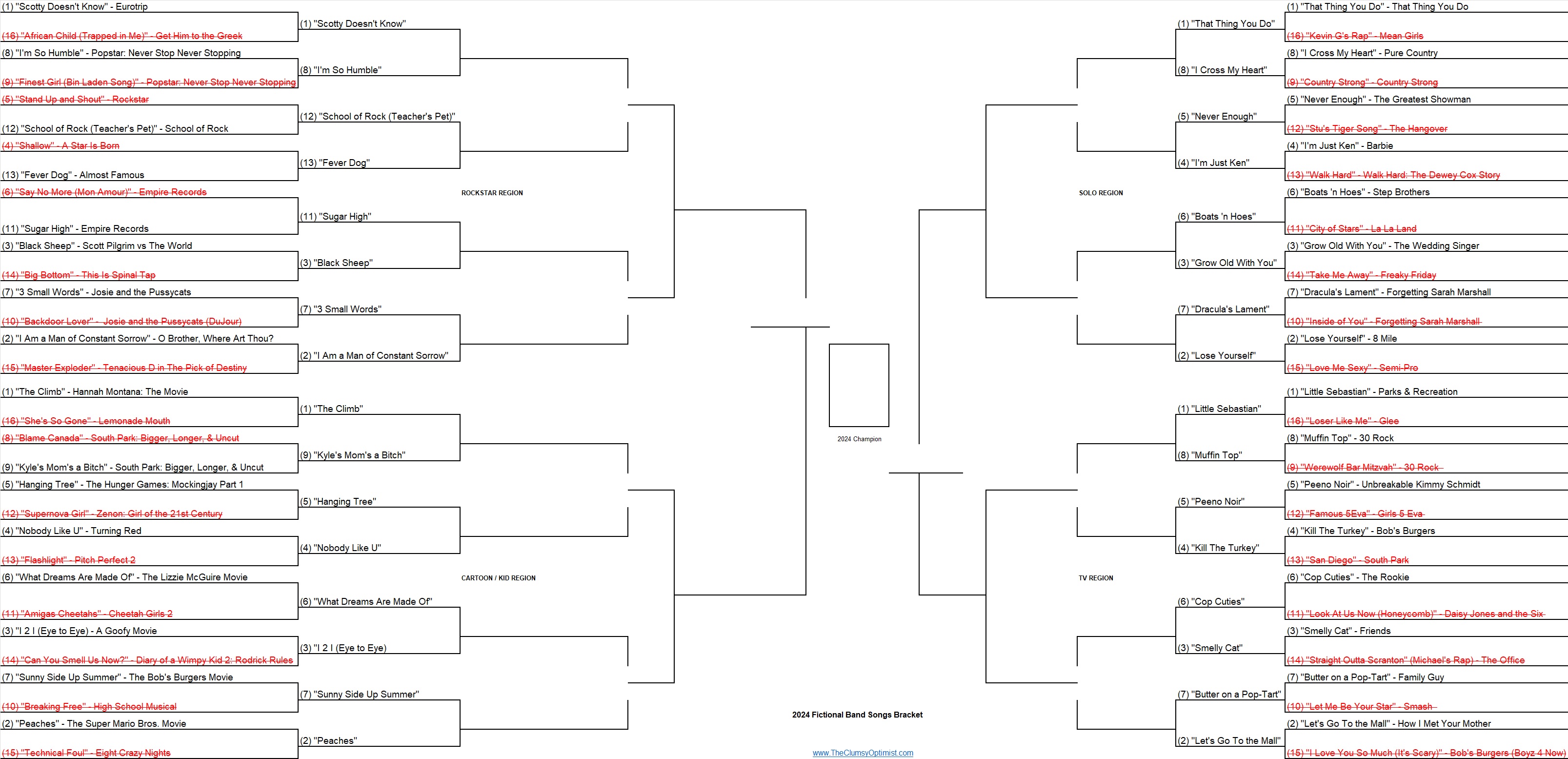 The entirety of the Bob’s Burgers universe makes me so happy but especially this number from the Belcher clan in The Bob’s Burgers Movie. It got a tough show from the High School Musical 10 seed but ultimately the higher seed moves along by a final of 64-36.