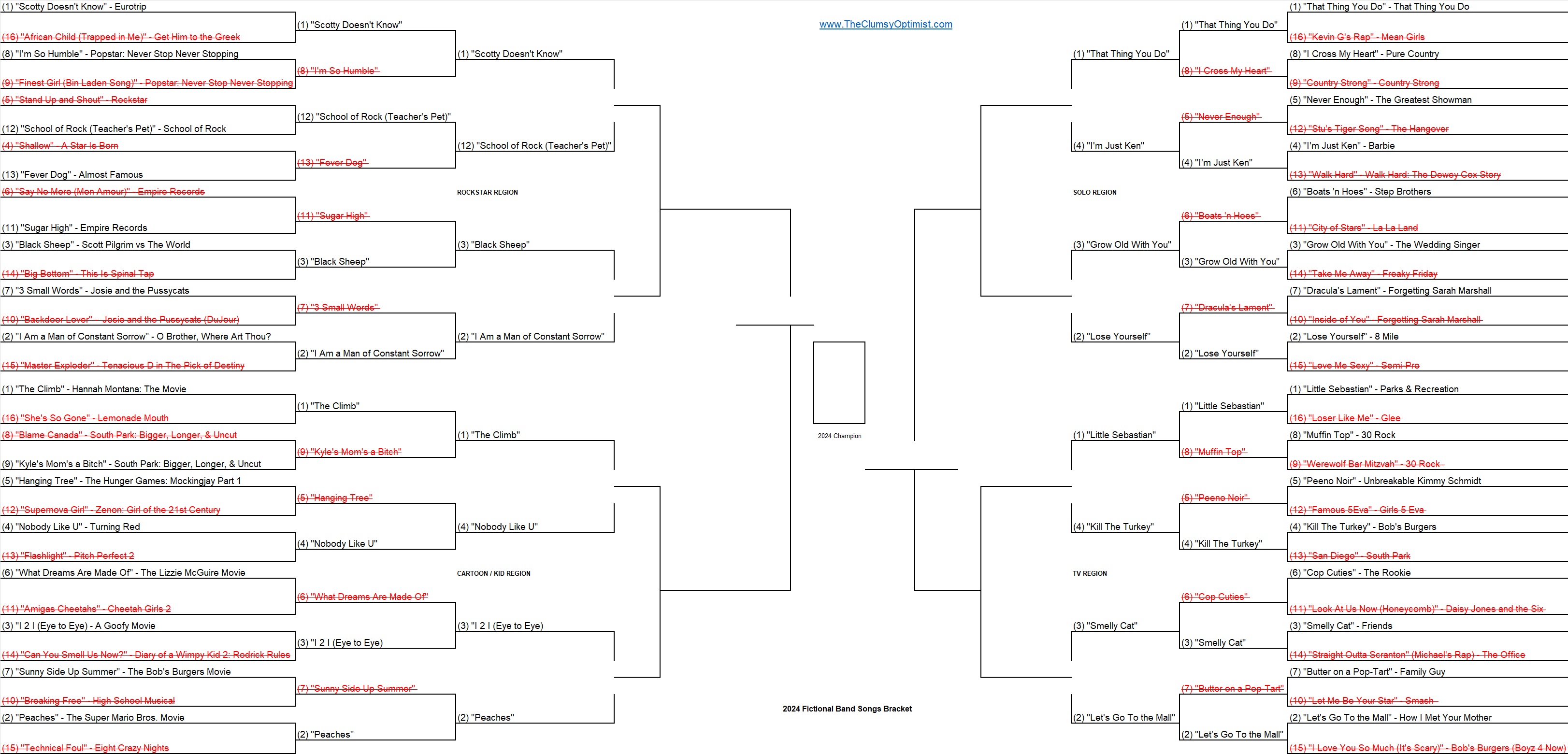 Our Rockstar Region 1 seed is just so incredibly strong. The 8 seed “I’m So Humble” may have never really had a shot here even if it is one of the most catchy fake songs ever. We all knew what was coming here. “Scotty Doesn’t Know” moves on to the Regional Semis by a final of 85-15.