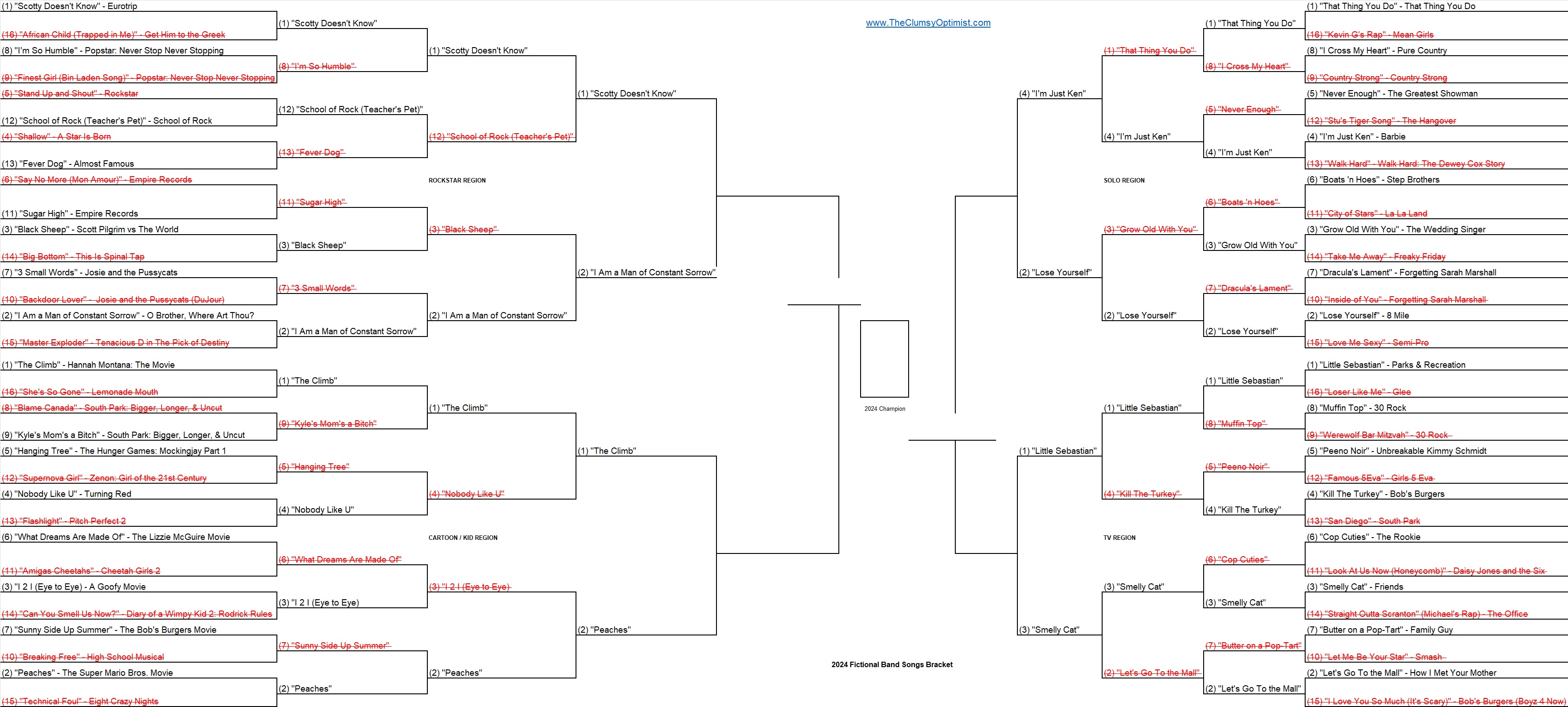 Our 2 seed in this region, “Lose Yourself”, was a fan favorite to win the whole thing. After getting a hell of a mouth punch in the Round of 32 from “Dracula’s Lament”, they struggled mightily with the Adam Sandler 3 seed. I was a little surprised by the closeness here but every time I checked in on this one, either team was up by only one vote. It was such a wild ride. The final here gave us the second tie of our entire tournament so far. Mrs. Clumsy Optimist was conscripted to break the tie on two of her favorites. I had no idea what she would pick but was a touch surprised when she landed on 2 seed “Lose Yourself”. Farewell, “Grow Old With You”, you beautiful record.