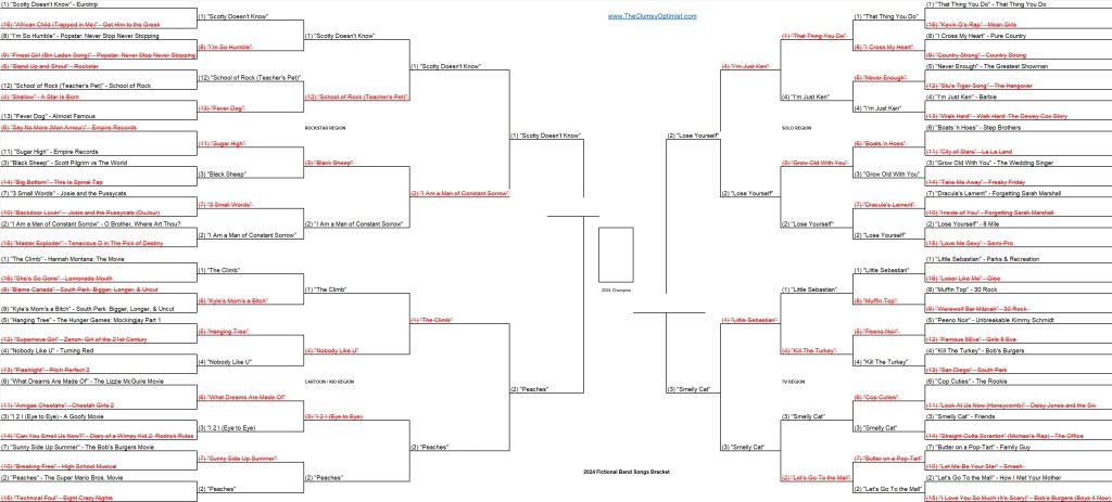 Again. This right side. What a ride! I knew when this match-up was finalized that we could very well see another 1 seed fall. And it seemed to be materializing before our eyes as the Parks & Recreation horsey memorial song was down early. They made a big push throughout voting and did the work – this one was in a tie as of Wednesday morning! Late voting went the way of the elder millennials and 3 seed “Smelly Cat” from Friends fought their way to a two-vote coup, knocking off another 1 seed, and taking the TV Region by a final score of 54-46. Bye Bye, Li’l Sebastian, indeed.
