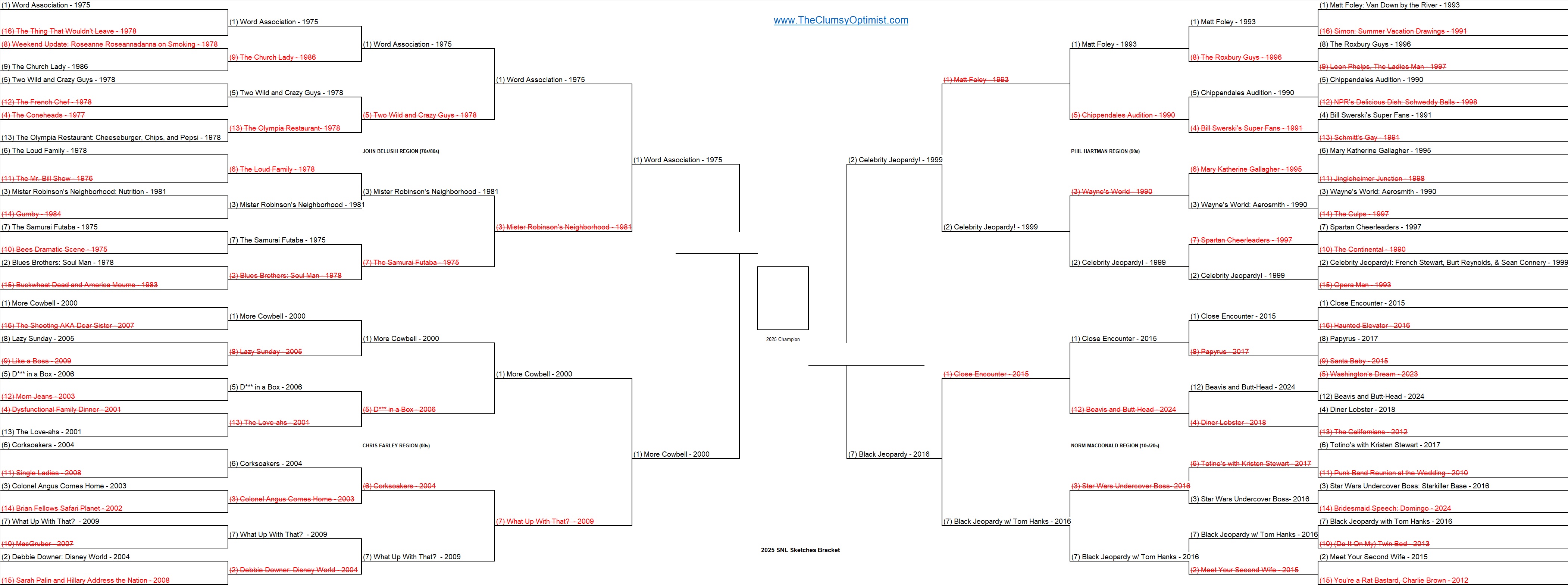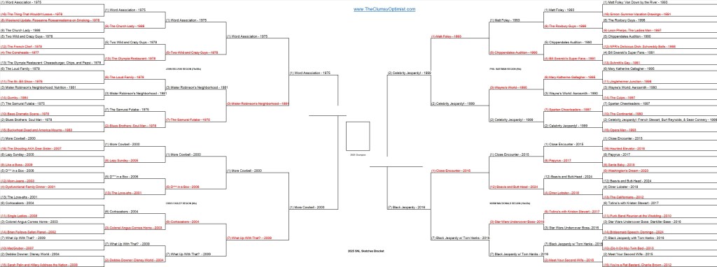 I had a decent feeling in my gut that we could possibly mimic the real NCAA Men’s Tournament Final 4 and get all of our 1 seeds representing. This region’s 1 seed ‘Matt Foley’ remains one of the funniest comedy sketches in my lifetime. That being said, this match was back and forth all throughout the voting period and 2 seed ‘Celebrity Jeopardy!’ eked out a 1 vote win (!) and sent poor old Matt back to his van down by the river. The 2 seed takes the Phil Hartman Region 54-46.
