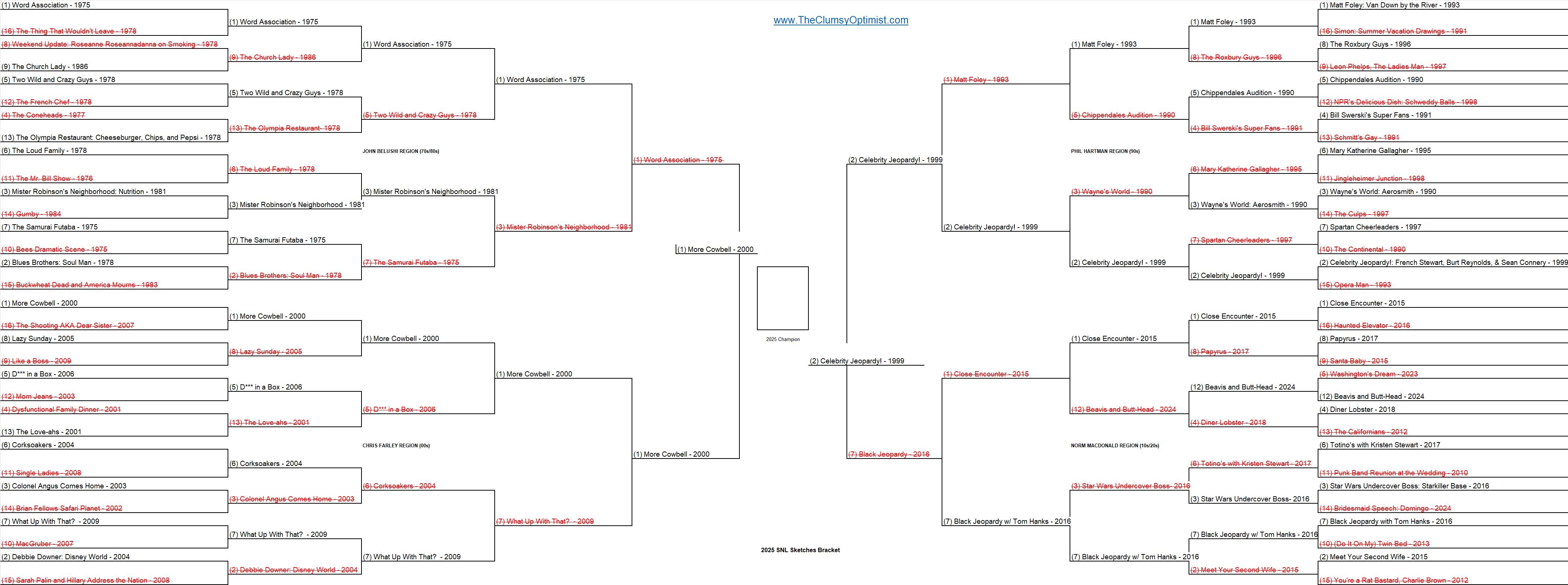 Where the left side of our bracket was represented by 1 seeds, we had a couple of upsets on the right side. The Phil Hartman Region (1990-1999) 2 seed started off with our third 100-0 victory as ‘Celebrity Jeopardy!’ destroyed 15 seed ‘Opera Man’. A third straight Round of 32 73-27 outcome saw our 2 seed move on over 7 seed ‘Spartans Cheerleaders’. The Sweet 16 was a shock to me as ‘Celebrity Jeopardy!’ took out a massive contender in 3 seed ‘Wayne’s World’ by a final of 87-13. Not even close! The Regional Final gave us a classic 1v2 matchup as the 2 seed got a 1-vote victory over what I thought was a sketch that could win the whole thing in 1 seed ‘Matt Foley: Van Down By the River’ – the final here was 54-46.