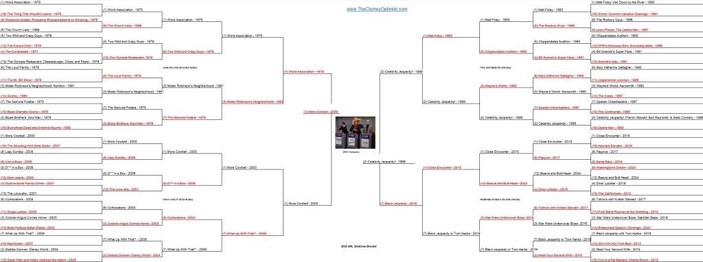 Where the left side of our bracket was represented by 1 seeds, we had a couple of upsets on the right side. The Phil Hartman Region (1990-1999) 2 seed started off with our third 100-0 victory as ‘Celebrity Jeopardy!’ destroyed 15 seed ‘Opera Man’. A third straight Round of 32 73-27 outcome saw our 2 seed move on over 7 seed ‘Spartans Cheerleaders’. The Sweet 16 was a shock to me as ‘Celebrity Jeopardy!’ took out a massive contender in 3 seed ‘Wayne’s World’ by a final of 87-13. Not even close! The Regional Final gave us a classic 1v2 matchup as the 2 seed got a 1-vote victory over what I thought was a sketch that could win the whole thing in 1 seed ‘Matt Foley: Van Down By the River’ – the final here was 54-46. Whereas the first Semi-final came down to a single vote, this one was out of reach early and despite a valiant effort at a late comeback, our Phil Hartman Region champ gets the victory and moves on to the Championship! In a battle of the ‘Jeopardy!’ parodies, ‘Celebrity Jeopardy!’ outlasted Norm Macdonald Region (2010-2025) champ ‘Black Jeopardy!’ by a final of 67-33.