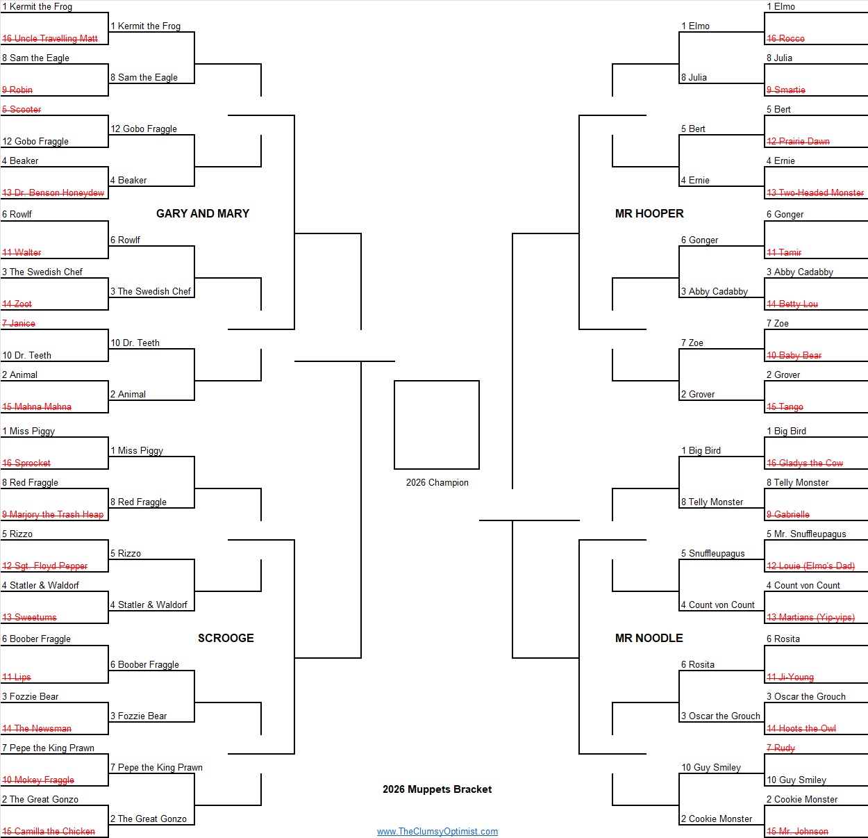 We got our 2026 tournament started off with a bang as 16 seed Uncle Travelling Matt could only muster one vote and falls to the Gary & Mary Region 1 seed Kermit by a final of 97-3.