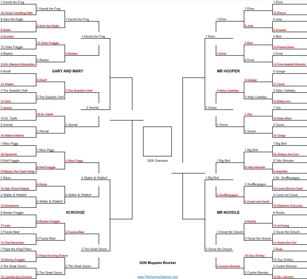 I do feel like the Gary/Mary Region and the Mr. Hooper Region were quite top heavy with the 1 and 2 seeds being clear favorites. The 1 seed here, Elmo, faced his toughest competition yet, but 4 seed Ernie just did not have the fire power, falling to the little red monster by a final of 71-29.