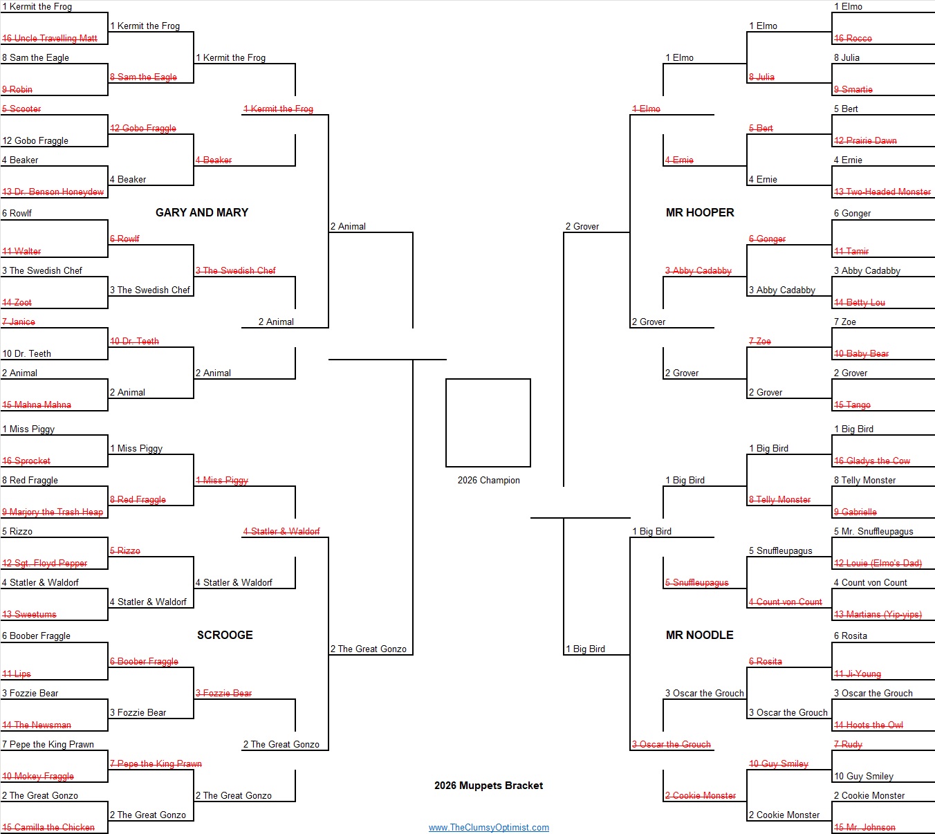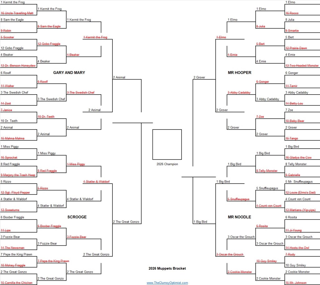We head into the Semi-Finals with a classic Muppet Show matchup in Animal/Gonzo on the left side of the bracket and a really tough Sesame Street showdown in Big Bird/Grover on the right side of the bracket. How do you even pick? Who knows. Wouldn’t have it any other way.
