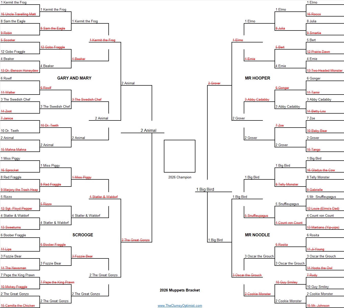 The Scrooge Region had a very similar track to the final as 2 seed Gonzo kicked out girlfriend Camilla the Chicken in the Round of 64 by a final of 90-10. He did run into a bit of a tougher opponent in the Round of 32 as personal hero and 7 seed Pepe the King Prawn almost got an upset but ultimately fell short 59-41. The Sweet 16 saw a battle of two of the bigger stars of The Muppet Show but Gonzo took down Fozzie Bear 65-35. The Elite 8 was a battle I thought The Great Gonzo could lose as our voters took a massive liking to the great hecklers Statler & Waldorf but Gonzo held firm, winning by three votes 54-46.